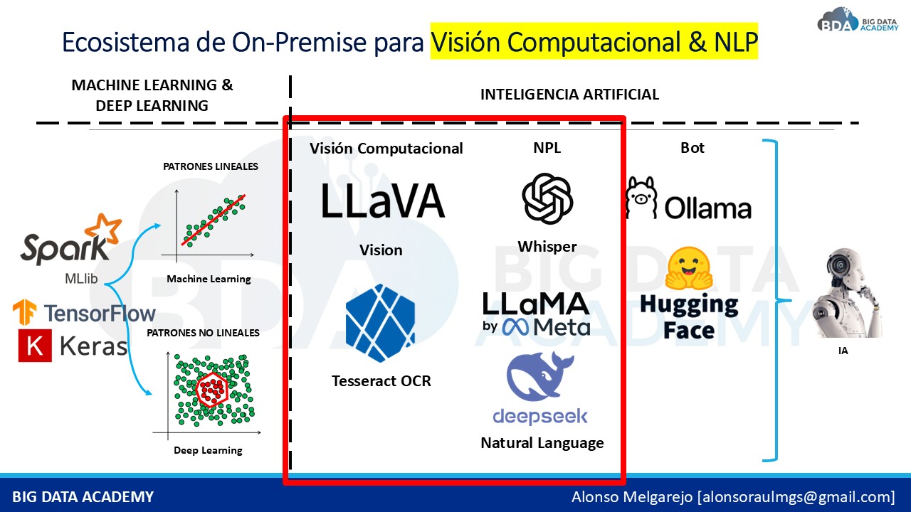 FUNDAMENTOS DE I.A. Y ECOSISTEMA ON-PREMISE: Aprende desde cero los conceptos clave de Inteligencia Artificial Clásica y Generativa, sus diferencias, y cómo aplicarlas en contextos empresariales. Comprende el rol de la Ciencia de Datos, Machine Learning y Deep Learning en la toma de decisiones y explora el ecosistema de herramientas de I.A. open source utilizadas en entornos locales.